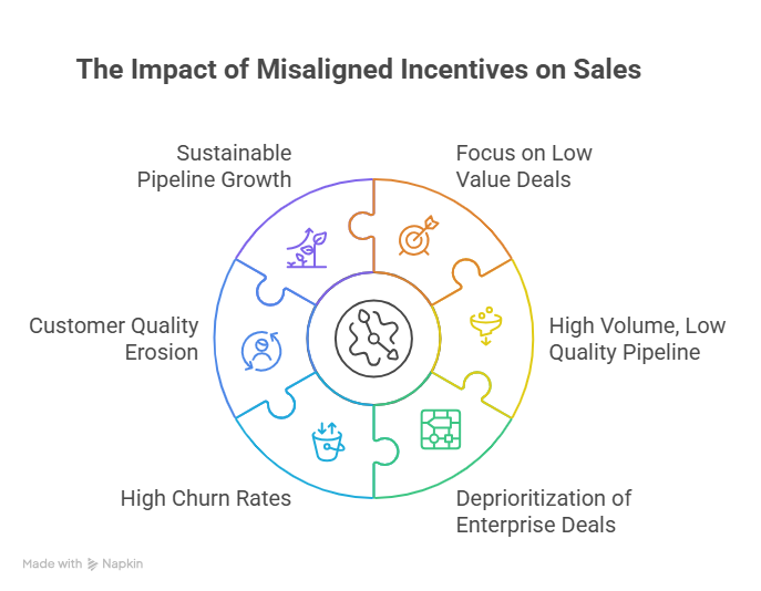Key takeaway: When incentives are misaligned, reps focus on what gets rewarded rather than what drives long term revenue, leading to poor deal quality and missed strategic opportunities.
