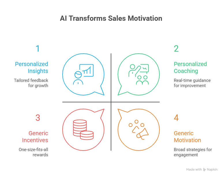 AI is changing how sales teams stay motivated by moving beyond generic approaches to more personalised, data driven strategies. Instead of relying on guesswork, AI provides real time insights, tailored coaching, and smarter incentives that align with individual performance. This shift not only improves productivity but also keeps sales reps more engaged, focused, and driven to achieve better results.