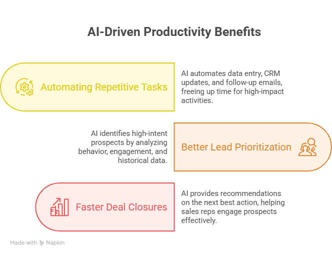 Productivity and motivation in sales are closely connected; when teams work more efficiently, they naturally feel more confident and driven. AI plays a key role here by eliminating time consuming tasks, streamlining workflows, and helping reps focus on high impact activities. As a result, sales professionals can achieve better outcomes with less effort, leading to higher motivation and improved overall performance.