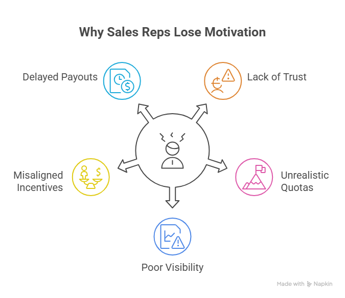 Sales reps often lose motivation due to unclear compensation plans, unrealistic targets, lack of recognition, and poor visibility into performance. When effort does not clearly translate into rewards, trust breaks down, leading to disengagement and reduced productivity.